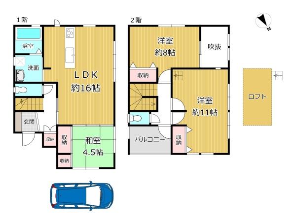 階数 区分 広さ 1F LDK 16.0帖 1F 和 4.5帖 2F 洋 8.0帖 2F 洋 11.0帖 - 駐車場