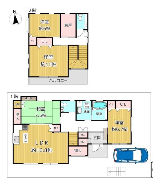 階数 区分 広さ 1F LDK 16.8帖 1F 和 7.5帖 1F 洋 6.7帖 2F 洋 6.0帖 2F 洋 10.0帖 - 駐車場